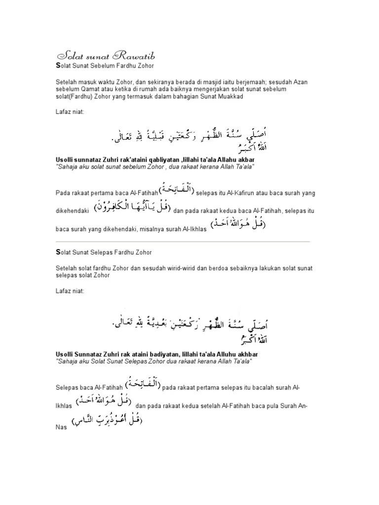 Niat Solat Qabliyah Subuh : Niat Solat Sunat Maghrib. Solat rawatib di waktu fardu subuh dikerjakan sesudah azan subuh (sebelum iqamat) sebanyak dua rakaat. Caranya sama sebagaimana solat sunat dua rakaat yang lain. Pertanyaan kami tentang bacaan dzikir pagi petang. Sebelum mengerjakan solat ini, kita boleh mengerjakan solat isyraq bagi mereka yang beriktikaf di masjid selepas solat subuh. Jika kita membaca dzikir pagi setelah sholat subuh dimana kita sudah membaca ayat kursi pada dzikir setelah sholat, apakah perlu dibaca ulang pada dzikir pagi, ataukah dianggap sudah diamalkan dan tidak perlu dibaca lagi. May 09, 2012 · terjemahan ta'lim muta'allim mushanif :